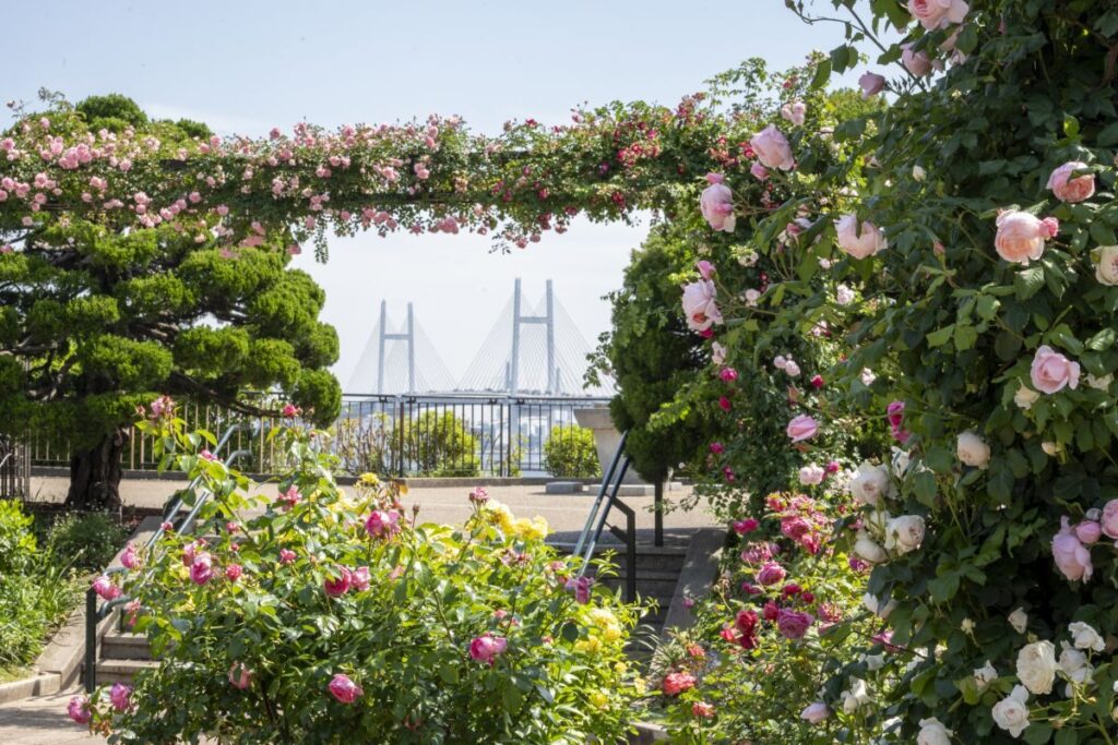 英国風庭園をモチーフにしたバラ園が広がり、歩き進めるとベイブリッジを見下ろす開放的な景色を楽しめます。